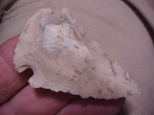 Sangamon county, Illinois (Springfield area), Burlington Chert2&1/8" by 1&7/16, 3/8" thickness, authentic in every detail--the Dove must have started much longer as those beveled edges are steep beveled--that tells you a lot of blade was lost in multiple sharpenings. Nice piece, great basal edge grinding. Shipping is $6.00, and please note that I do NOT use paypal--I welcome checks, cash, or money orders, though--Roy A.