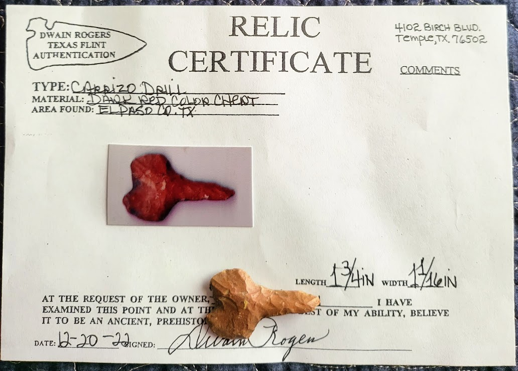 This is a rare form of a Carrizo drill found in El Paso Co., TX. It comes with a Dwain Rogers COA. This is a must-have for Texas drill collectors!