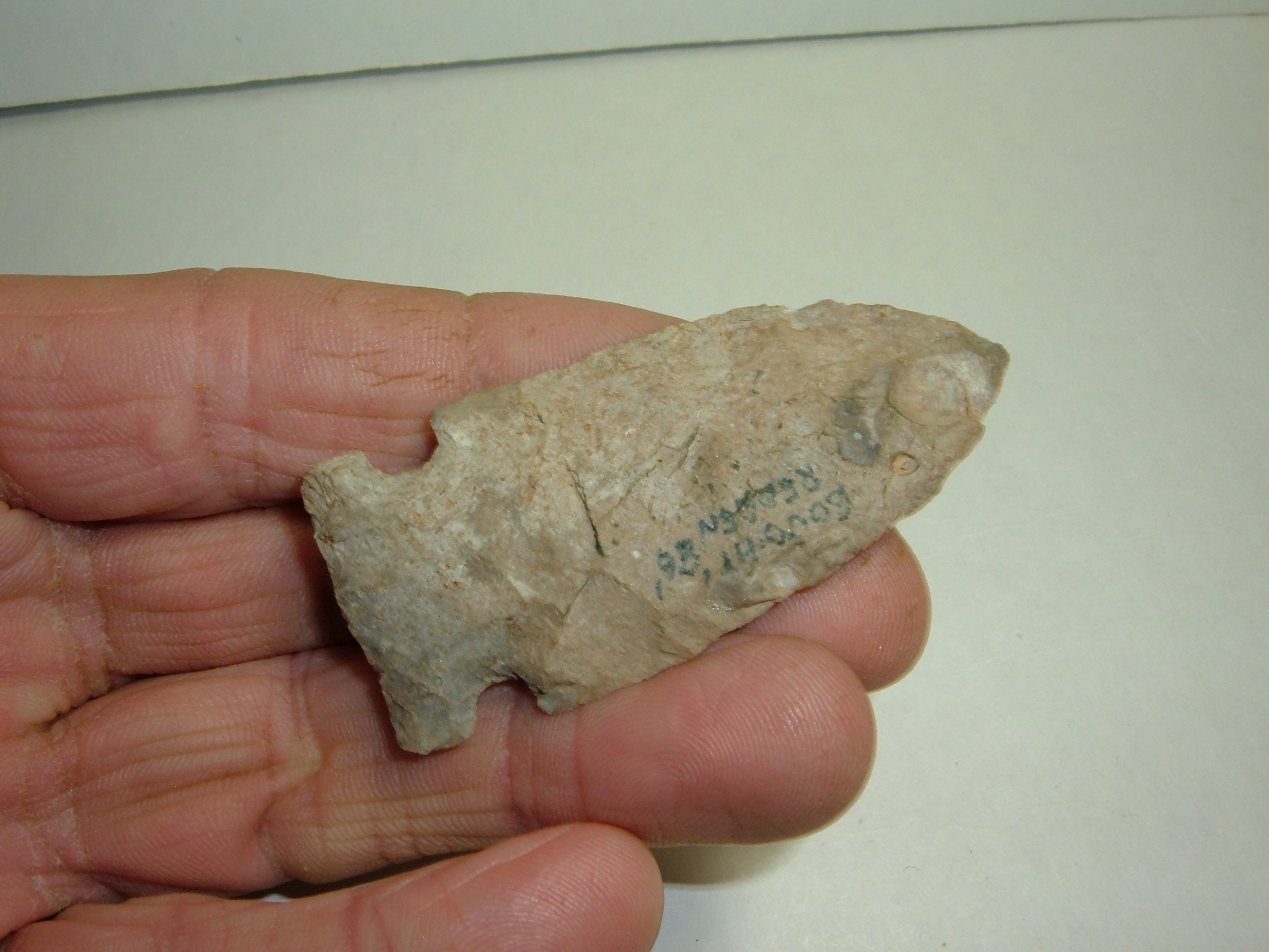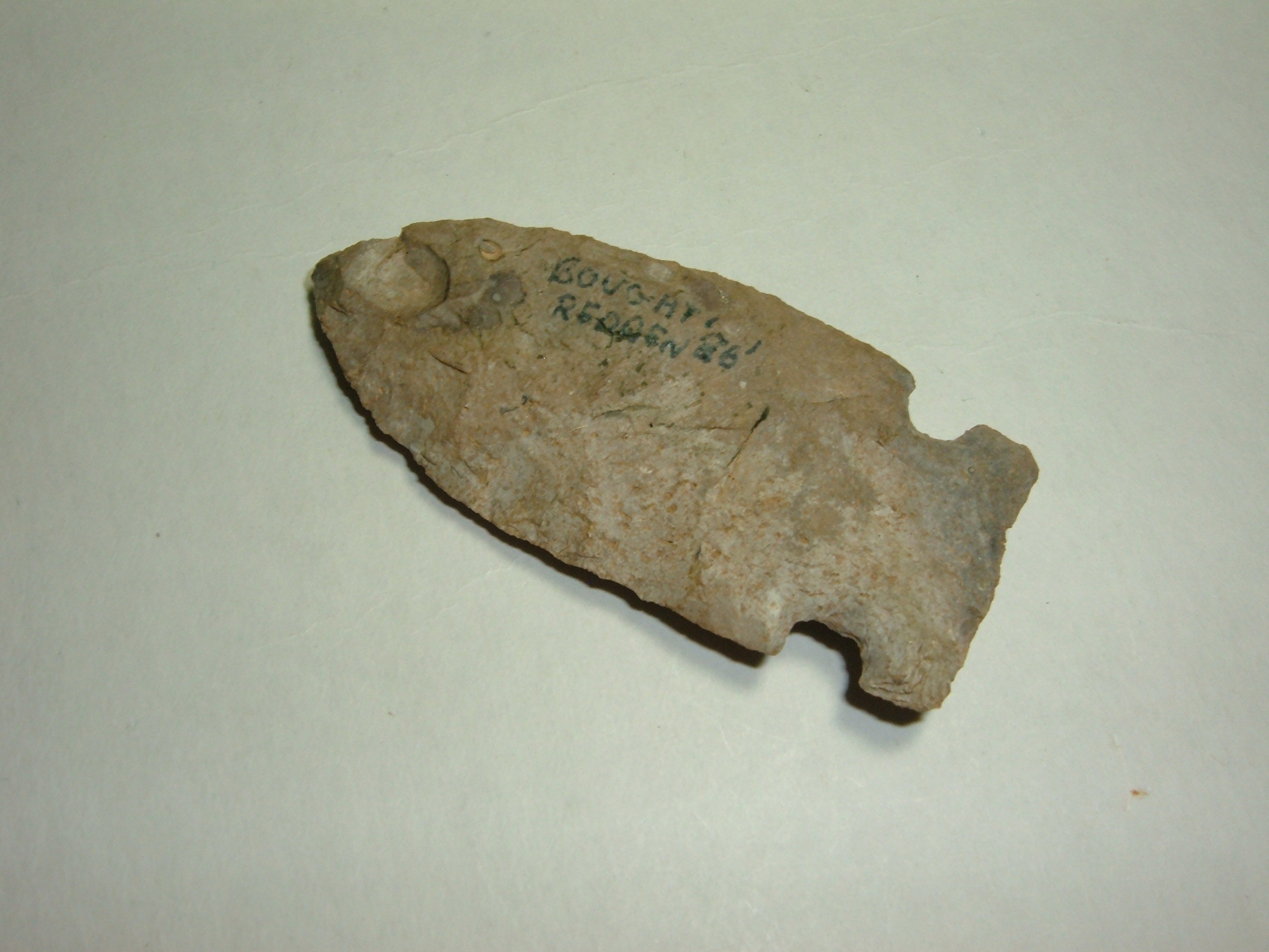 OFFERED HERE FROM OUR PERSONAL COLLECTIONS IS THIS NICE ARCHAIC SIDENOTCHFOUND IN ATHENS CO,OHIO AND IS 2 1/2"! MADE FROM BISHER CHERT, IT HAS WRITTEN BOUGHT REDDEN 86 ON ONE SIDE AND IS A VERY NICE ARCHAIC EXAMPLE!