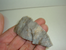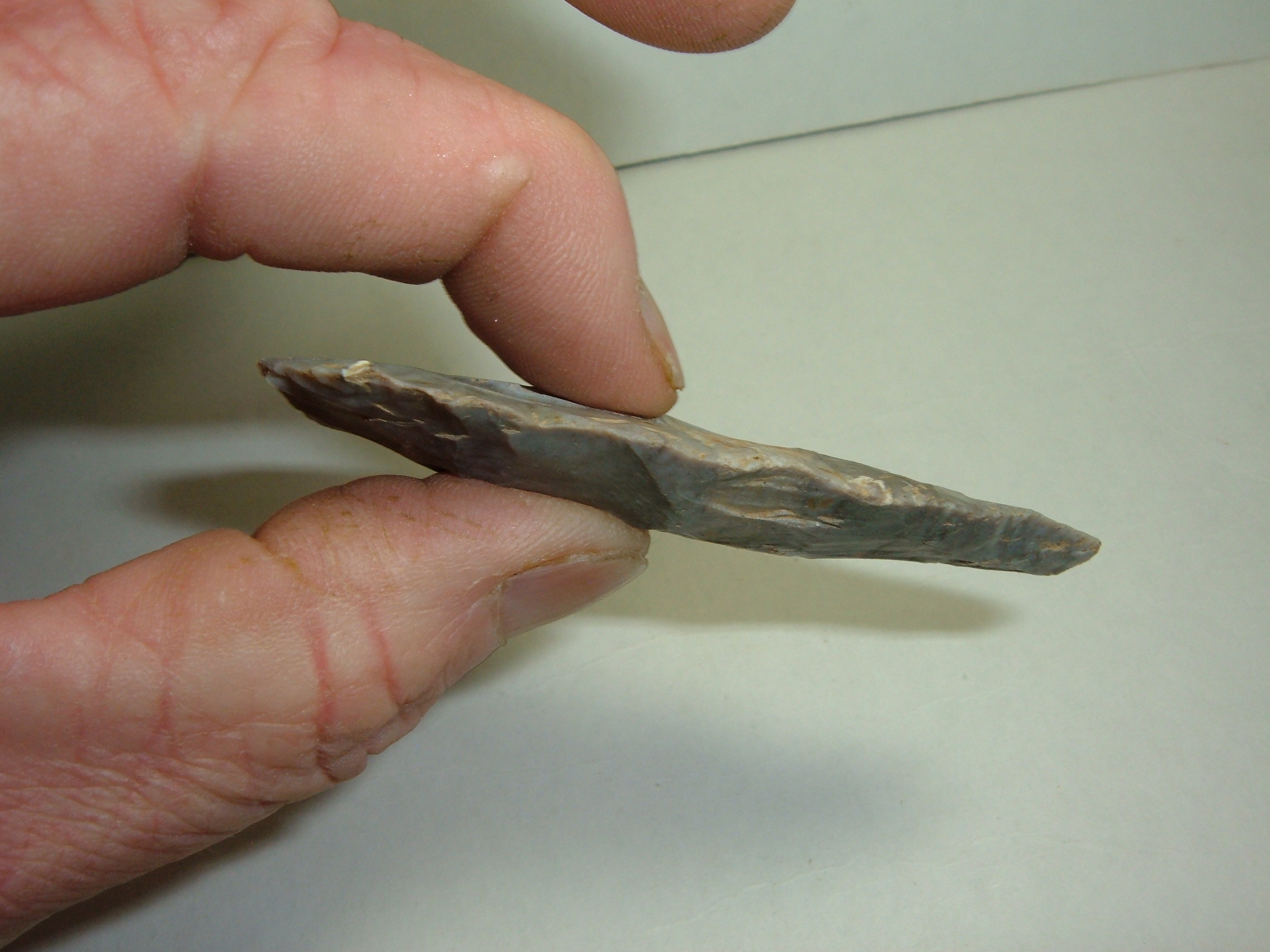 THIS NICE HOPEWELL CACHE BLADE WAS FOUND BY JIM BARKER IN COSHOCTON CO.OHIO AND IS NICE SIZE AT 3"! IT IS MADE FROM MOTTLED GRAY COSHOCTON FLINT AND HAS A NEAT SPOKESHAVE ON ONE SIDE! FINE EXAMPLE OF THE HOPEWELL IN OHIO.