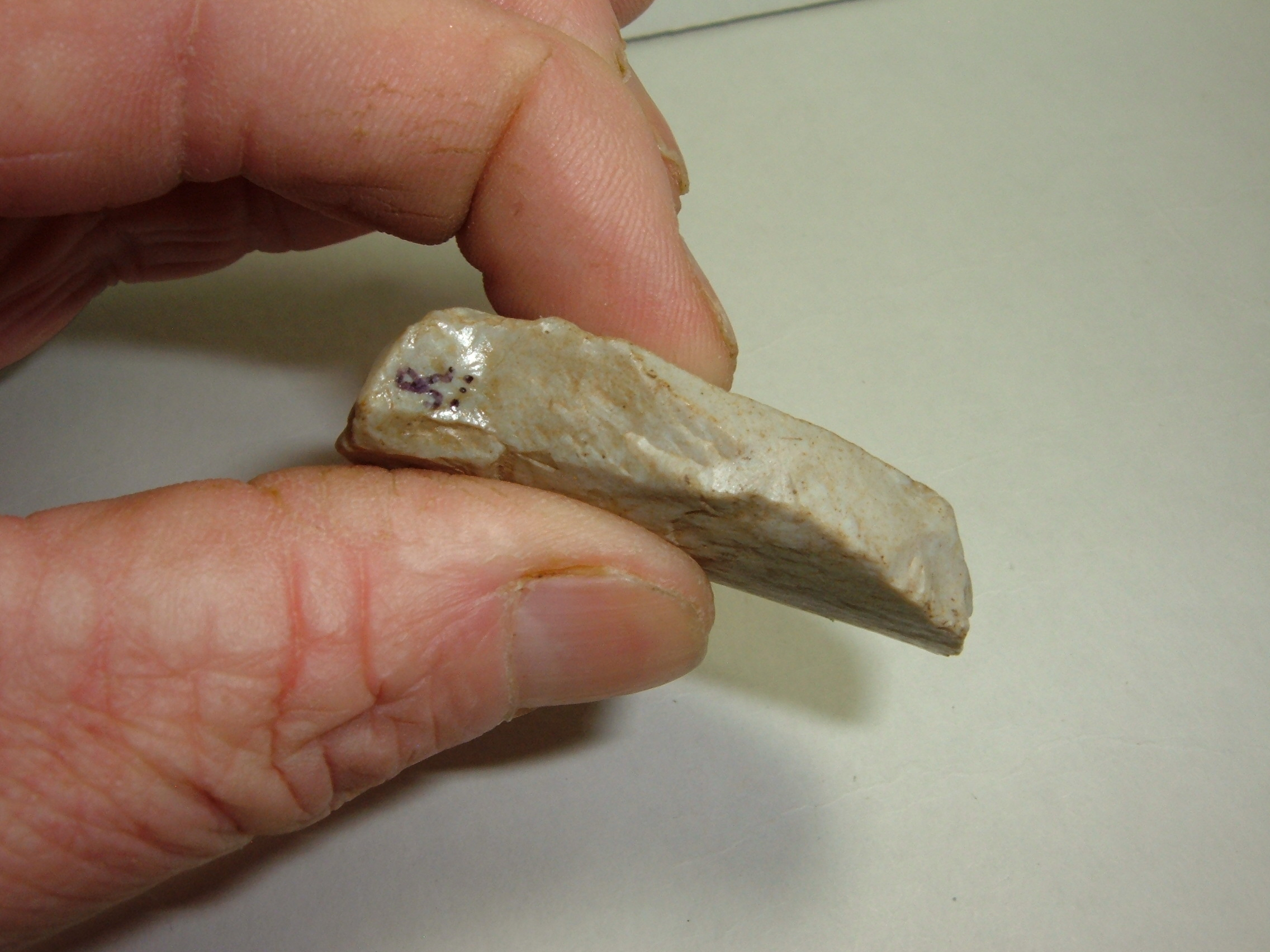 THIS NICE LARGE PALEO THUMB SCRAPER, 2" WAS FOUND IN COSHOCTON CO.OHIO AND IS EX JIM BARKER! MATERIAL IS COSHOCTON GRAY FLINT,EARLY AND NICE!