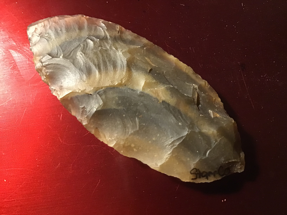 The material is outstanding, thin, and very colorful. Recovered in Starr County, this Bi-Pointed Knife is made of quality Edwards. It does not have grinding and shows ancient resharpening. I have the shipping and it comes with a Bill German coa.