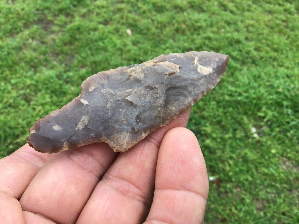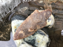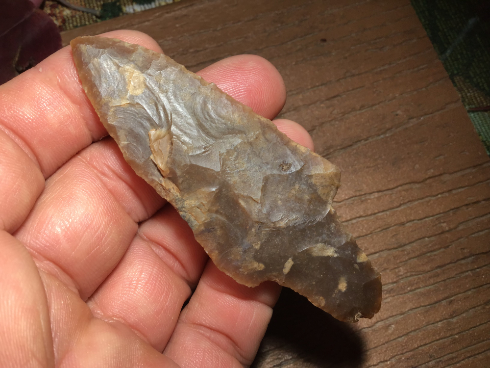 Made out of quality Colorado River Gravel Chert, this nice sized Wells lights up extremely well with a great tip and long, rounded base. It is pressure flaked on the lateral edges and the base is lightly ground. It is fresh out of the ground and came out of a Paleo/Ango camp. I have the shipping and will guarantee authenticity and satisfaction.