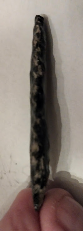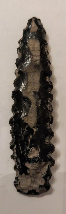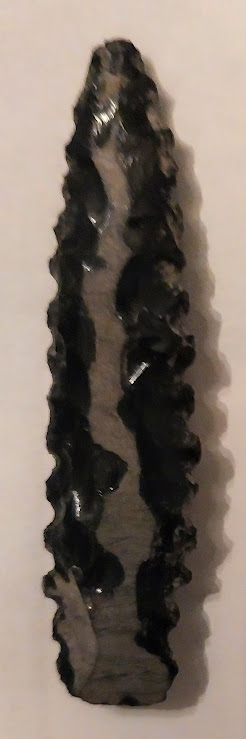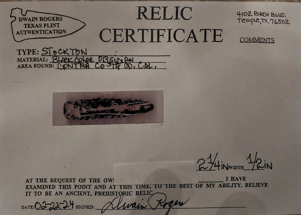 This is a very rare Stockton point made of obsidian. This point has decent size at 2.25" and the characteristic square notches found on this type point. The point was found in Contra Costa, California and comes with a Dwain Rogers COA. It is very seldom that authentic points of this type become available.