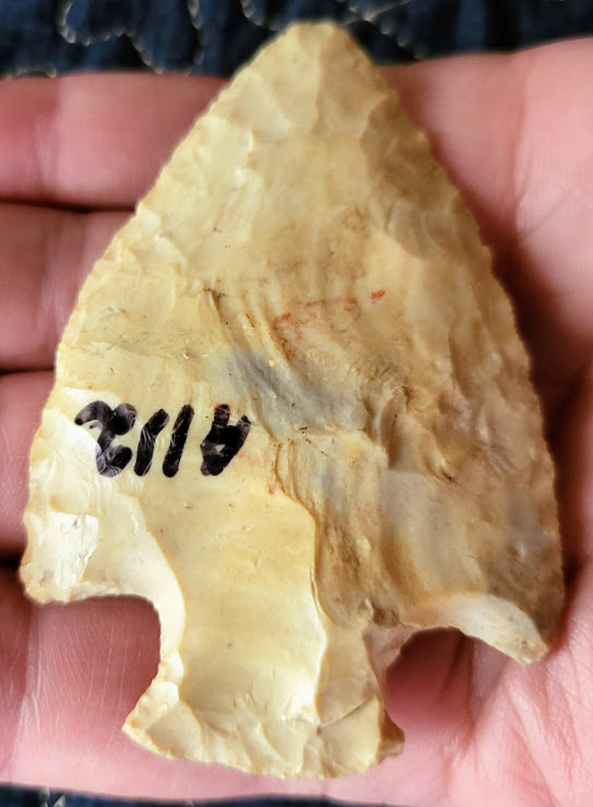 This classically shaped Snyders point is made out of heat-treated Burlington chert. It was found in Missouri and comes with a Roy Motley COA.