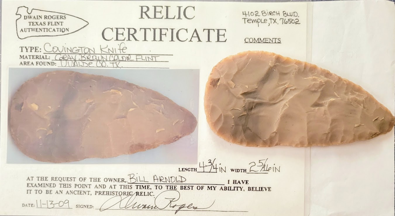 A large Covington blade made out of root beer flint. It was found in Uvalde Co., Texas and comes with a Dwain Rogers COA.