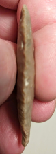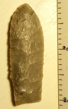 This rare, paleo point was found in Central Texas. It is thin for its size and both edges of the stem are ground. The point is semi-translucent and comes with a Dwain Rogers COA.