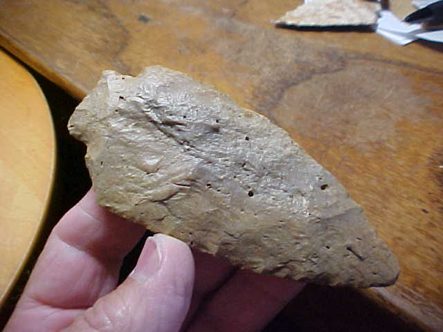 An extra large Benton from the creeks of far western Kentucky--Crittenden County--lots of Mid Archaic Period wear and subsequent creek polish from sand & water moving over the 4" (slightly over 4") blade. Width is 1&3/4", and thickness reaches 9/16". Flint is some form of Kaolin, the kind of material often used for hand Celts in western KY--really patinated, authentic. Shipping is $8.00 with checks or M.O>s welcomed. Sorry, I do not use paypal on my store--Roy A.