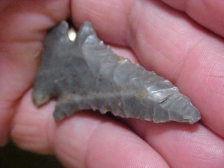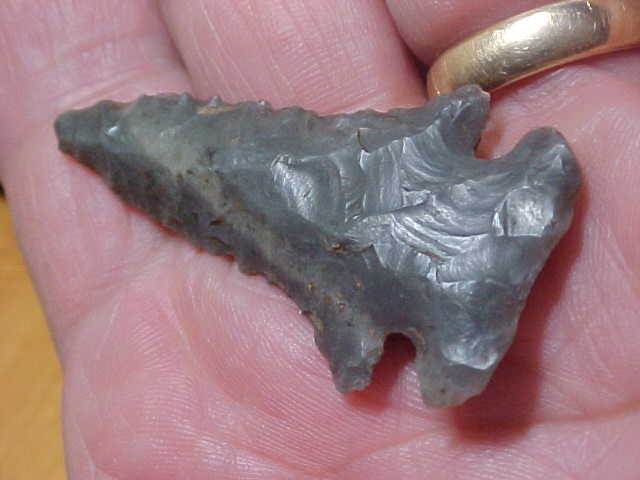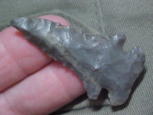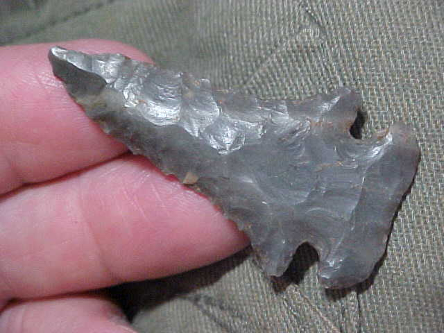 A Union County, Kentucky, Pinetree that was part of Dr. Skaggs collection--either a very high grade of Hornstone or a Sonora Flint--the bandings of color in the matrix could well be Sonora--but not a lot of the purple hematite color Sonora normally shows. Length is 2&1/18" by 1&1/8", the length reduced by multiple sharpenings and a very old Early Archaic-made impact fracture to the tip. Some of that channel flake coming down from the tip is a clear indicator of an impact fracture. The basal grinding is super heavy--out-and-out polish, not just grinding. The piece comes not only with a lifetime guarantee of authenticity, but some background information gathered at the Skaggs Auction as to the actual location of the find, who sold it to Dr. Skaggs. There were a number of Pinetrees from that site in the collection, and I've been curious if there was a creek where the finder collected what he sold to the Doctor--worth checking out as time permits. Shipping comes with the price, checks or M.O.s are welcomed. Sorry, my store doesn't use paypal--Roy A.