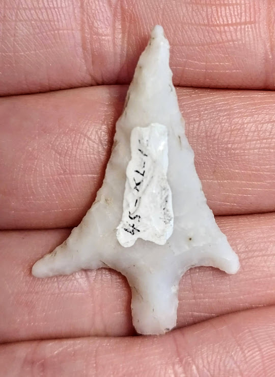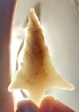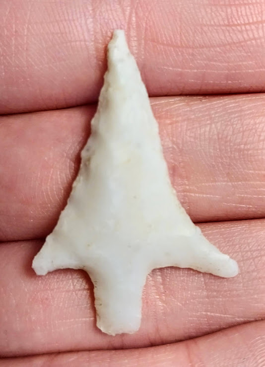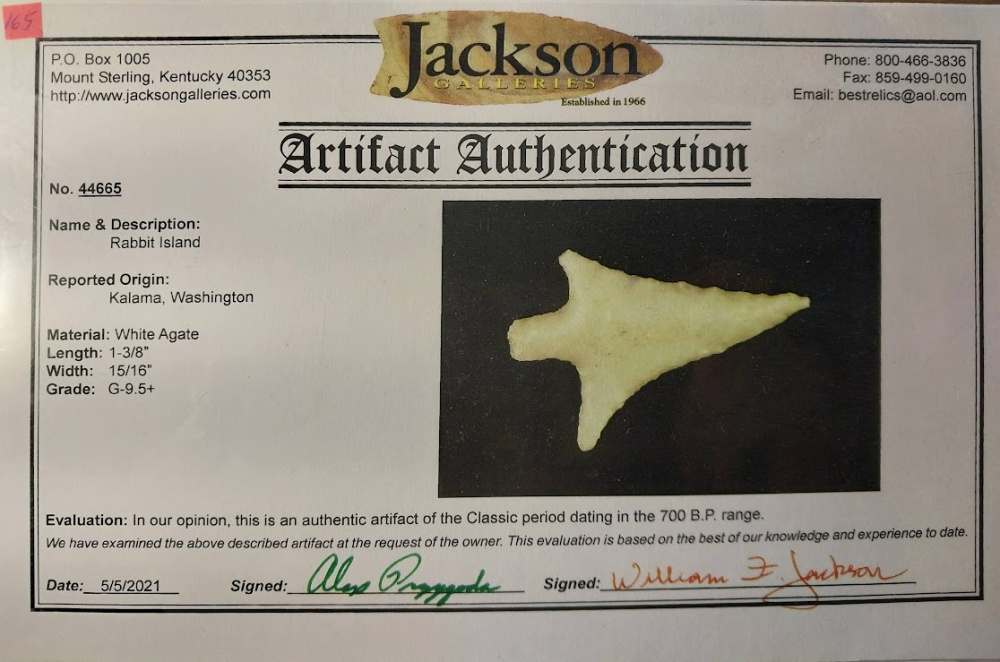 This is a fine example of a Rabbit Island point made out of a white agate. The point was found in Kalama, Washington and comes with a Jackson Galleries COA. One barb is shorter than the other but it's not broken. Jackson gives this point a grade of 9.5+.