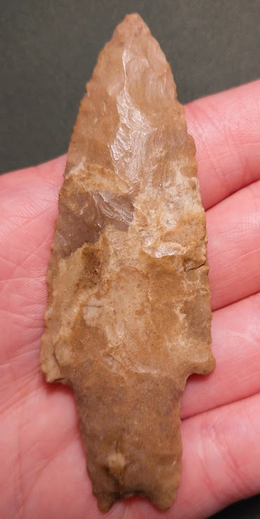 This thin, symmetrical Pedernales point has a very long base. It was found in central Texas and comes with a Dwain Rogers COA.