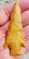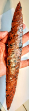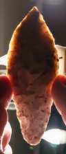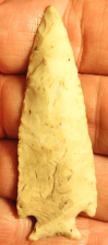 This is a very nice example of a symmetrical Harahey knife with alternate beveling on the edges. It was found in Grayson Co., Texas and comes with a Dwain Rogers COA. The slight notch on one side is from a sedimentary inclusion coming out of the material when the blade was sharpened.
