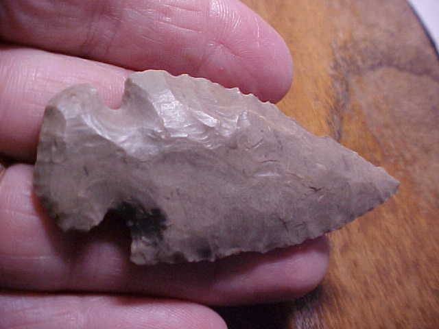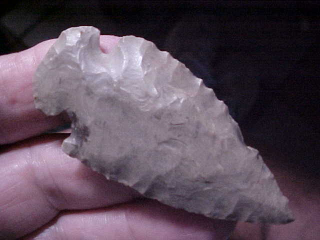 Warrick County, Indiana, Dovetail. The piece has a dark, almost quartz-quality inclusion in one corner of the basal notching, a natural feature. Length is 2&11/16" by 1&1/4". The base has excellent grinding--blade edges show all the ancient 'sharpening bevels', the blade having been reduced in size by that sharping action. A small blade-edge ding shows darker hornstone, but it's partially patinated, so it isn't farming-made damage--anything from farm implements wouldn't have time to 'age' in the way the patina shows--best way to say it is that the ding is guaranteed not to be modern damage, could be a later culture than the Early Archiac maker found and utilized the knife. Some damage, all you can do is study how each flake patinated, try to evaluate how the patina evolved. Lifetime guaranteed authentic, though. Shipping is $8.00, checks or M.O>s are welcomed. Sorry, I do not use paypal--Roy A.