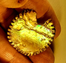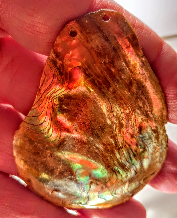 This cache of 15 abalone Shell Pendants was found in Yolo Co., California. The camera doesn't pick up the fantastic color highlights to be found in the Pacific ocean abalone shell, but they are filled with vibrant reds, greens, and blues. A former owner of the cache coated them in a light lacquer to protect them from deterioration and preserve the colors.