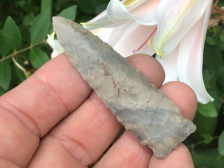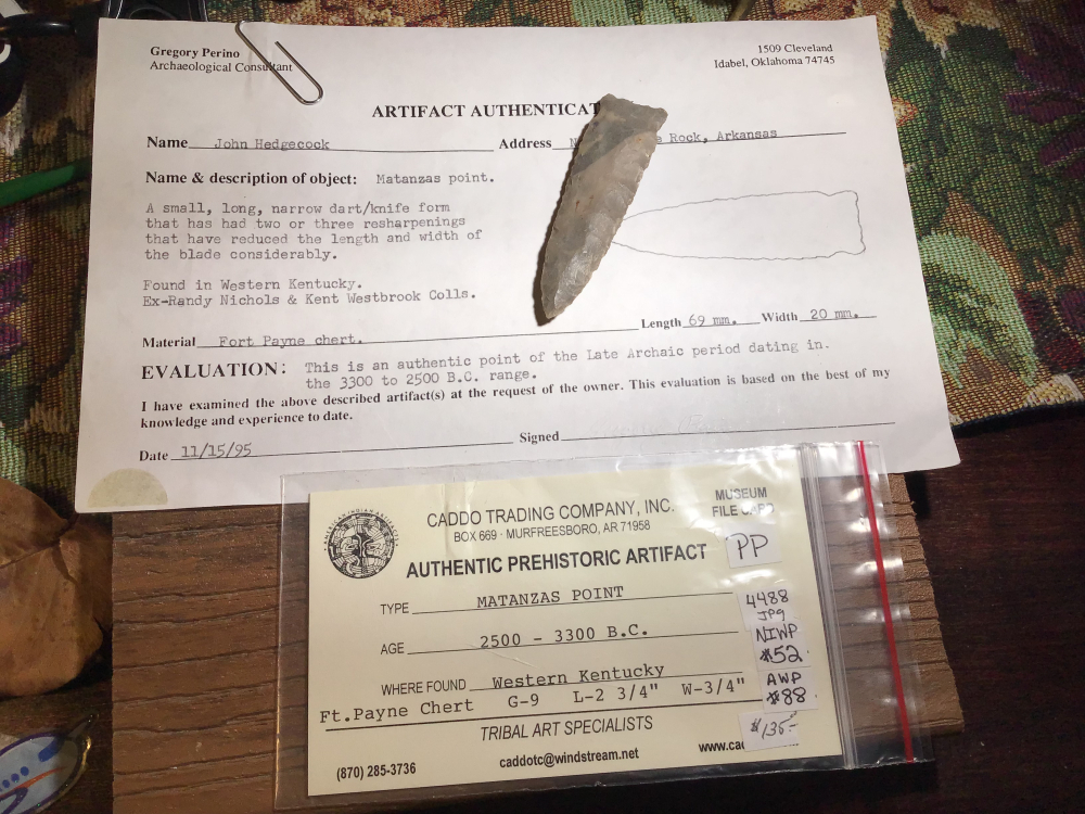 This Kentucky Matanzas is made out of Fort Payne chert with a nice tip and all edges that show use wear. Primarily found in the Mississippi, Ohio and Missouri River Valleys, the notches are cut high on the hafting end. A late Archaic point out of the Kent Westbrook Collection, it comes with a Caddo Trading file card and a Perino COA. I have the shipping.
