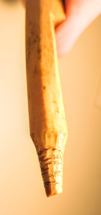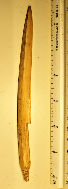 This beautiful and functional Eskimo Spear Point is made of an aged fossilized bone with a glossy look. This piece was dug on St. Lawrence Island, Alaska. (This spear is part of a 25-piece, high-end Eskimo frame that I will be listing here.)