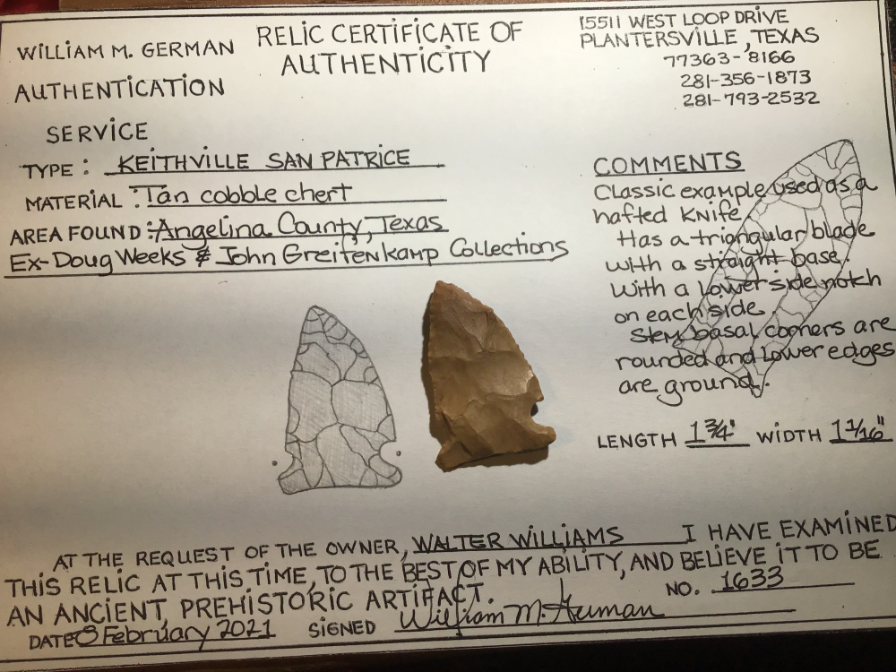 A very pretty Keithvielle our of Doug Weeks Collection from Angelina County. The baseis heavily ground and all edges show use wear with fine pressure flaking. It has a Bill German COA. I have the shipping.