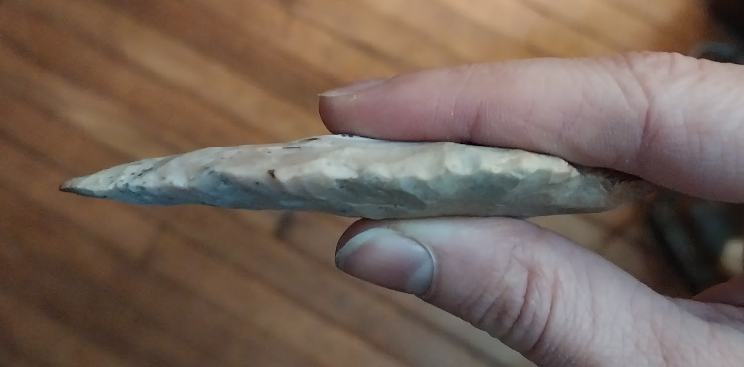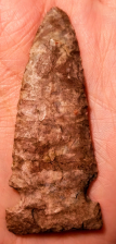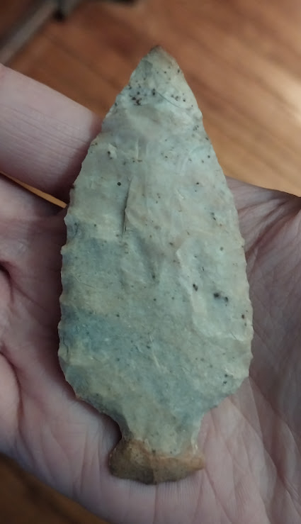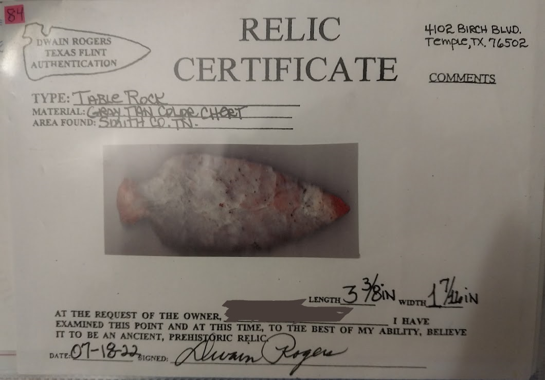 This Table Rock is large for its type, and it's made from mostly gray chert. It has a subtle brown coloring on the top and bottom that's interesting, almost like a Siamese cat. The point was found in Smith County, Tennessee and comes with a Dwain Rogers COA.