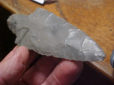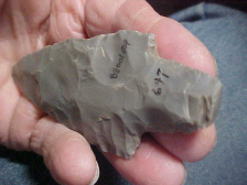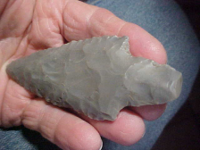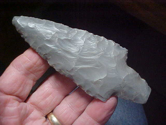 Out of an Illinois collection, Bill Pesch estate sale, one very large flat stem Adena, 4&7/16" by 1&5/8", a center thickness that is very near 7/16" in the center between the shoulders--one very large knife blade. To the feel, the flat stem is ground smooth--maybe that's simply due to wear, or it might have been deliberately smoothed--either way, that flat stem edge would 'socket' on a handle more securely than a pointed/ rounded stem. The Adena hunter knew what he needed when he made so large a knife. The tip shows use wear--not damage, just use. One face has a couple catalog numbers stenciled, but without the 'key' to the catalog there's only the auction catalog for any additional information; that'll be provided to the next owner. Great piece, guaranteed authentic. $8.00 is the shipping, no additional costs. Checks or M.O.s are welcomed, but I do not use paypal-type payment services--Roy A.