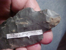 Off a family garden site in Macon County, Illinois--there, you'd expect a white Burlington Chert, but what the garden tiller brought up from that mostly Adena Culture site was dark Excello Flint, very dark blue with creamy inclusion bands. Other pieces ranged to a dull black--classic Excello Flint from the western part of Illinois, if you check on "Illinois Lithic Materials" site (excellent reference if you like studying flint that's found in each state). This long Adena is slightly over 3&7/8" by 1&3/8", and 3/8" or slightly over on the single thickest center ridge spot--as you move away from that slight stack the blade become very, very proportional in thickness, 5/16".The stem is edge-ground, looks like the Adena hunter removed an edge flake on the stem for better fit to the knife's handle--deliberate modification, it's not damage. One lower blade edge shows where the hunter repaired an edge chip from use--he 'cleaned up' a use-made ding. What I'm describing is all, every last chip guaranteed ancient. Off the side of the tip (see close up) is a small gardening-made chip--study the patina difference in that small spot, you'll easily see & understand the overall patina. Shipping is $8.00, checks or M.O.s are the only payments (other than cash) I use & welcome. Questions, please ask. If you have a counter offer, well, please, there is no reason to waste your time,--Roy A.
