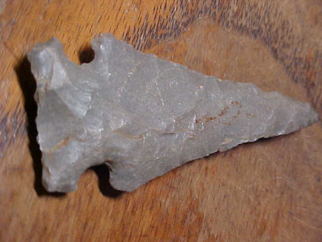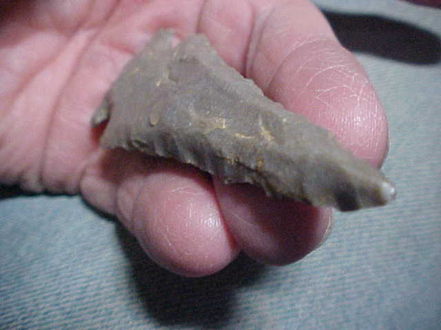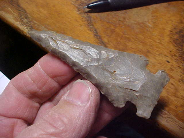 A Warrick County, Indiana, find, nice, very patinated piece of Indiana Harrison County-type Hornstone, 3&1/4" by 1&1/4"--VERY good length, and a max thickness of only 5/16", so the 'balance' is there, too. The width insside the basal notches is closer to the "E-notch form" of the Big Sandy than a standard or even Broad Base Big Sandy--one side, the base is more than a square notch, it hooks upward--that, I's why I type the Early Archaic point as an E-notch. Interesting features in the construction of the piece--the blade is beveled on only one face, both edges; the reverse isn't flat, but it's not far from it. You can take from that that there were a considerable number of ancient sharpenings. One other feature that doesn't seem to have an explanation is that the basal edge is NOT ground--deliberately not ground. Answering that "Why", when it's a rarity for Early Archaic points in general to have ground bases--why isn't this one? The piece is 100% guaranteed authentic, the patina is there, but I can't explain that basal edge--next artifact show I see Jerry Dickey I'll get his thoughts on the subject--I respect his opinions. Shipping is included with the price, checks or M.O>s are welcomed. Sorry, I do not use paypal--Roy A.