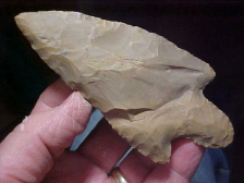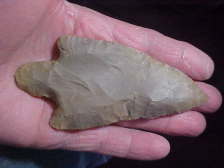 "Kinda big" is sort of an understatement here, I think you'll agree. Length is an outstanding 4&11/16" by 2&1/8". Measured on a 'stack' 1/2" is the single thickest spot. The hornstone type (Harrison County, Indiana, flint) was fractured, a huge flake of flint used for producing this Warrick County, Indiana, find. The flake wasn't a 'perfect biface' as the form & fracture planes show--regardless, the Adena knapper made a respectable knife, used the natural (split nodule) features to his advantage--percussion shaped (finished) edges, a superb stem (may have very slight edge dulling, but I wouldn't describe the stem as "ground". AS the blade is still somewhat sharp-edged I don't think the knife had much of a use life. The finder picked the piece up quite a few decades back as I understand it--wish I knew if he was an early creek hunter as a piece this size isn't generally a field find. Patina is lifetime guaranteed authentic in every detail. $8.00 shipping, checks or M.O.s welcomed. Sorry, I do not use paypal--Roy A.