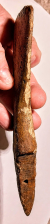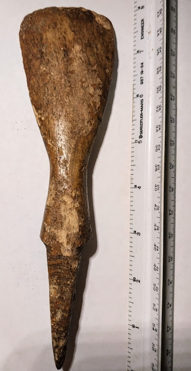 This is a very unusual Eskimo Bone Ax Head which was probably used to chop snow and ice. One end is for chopping and the other end is for mounting a handle. This handle portion is grooved and has a hole drilled through it to assist in attaching the handle.. A very well designed tool!