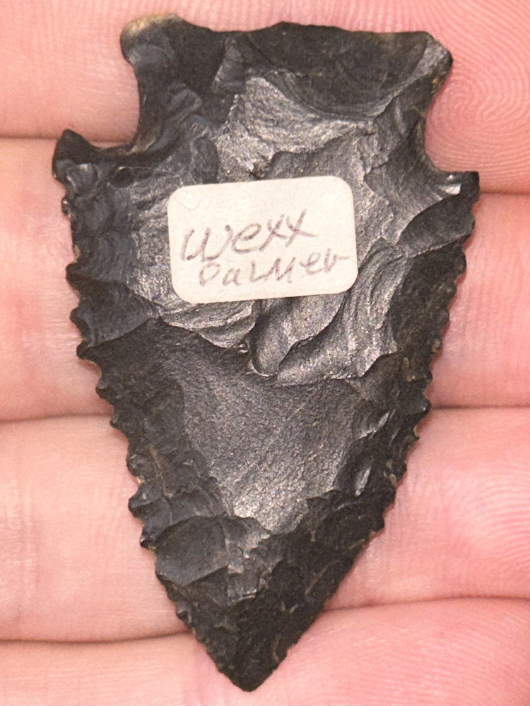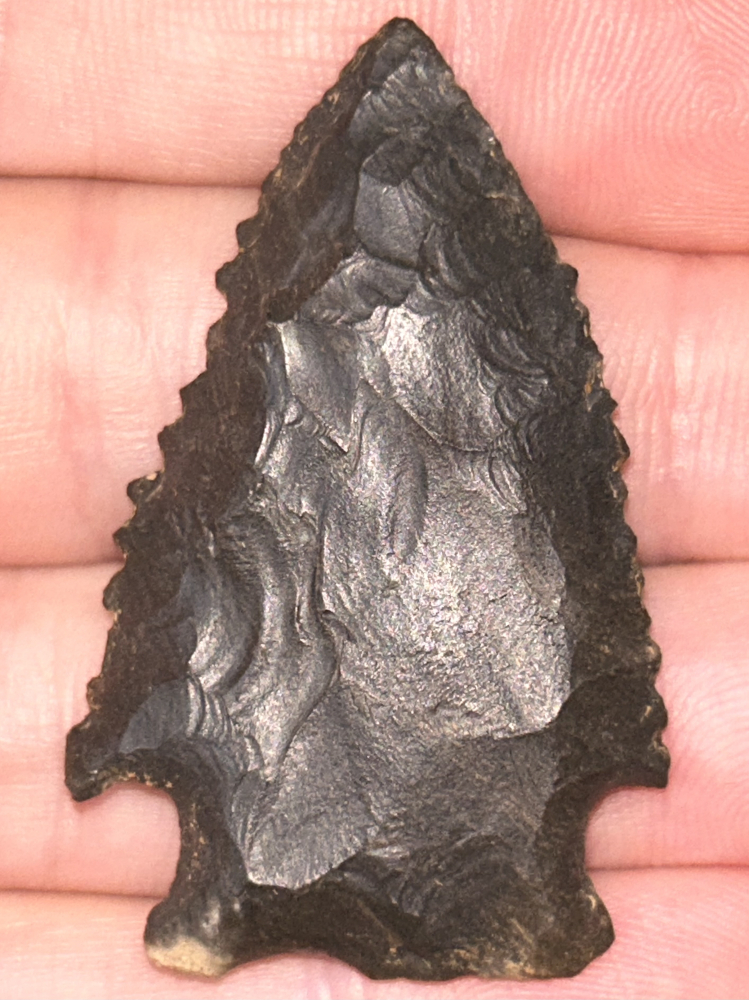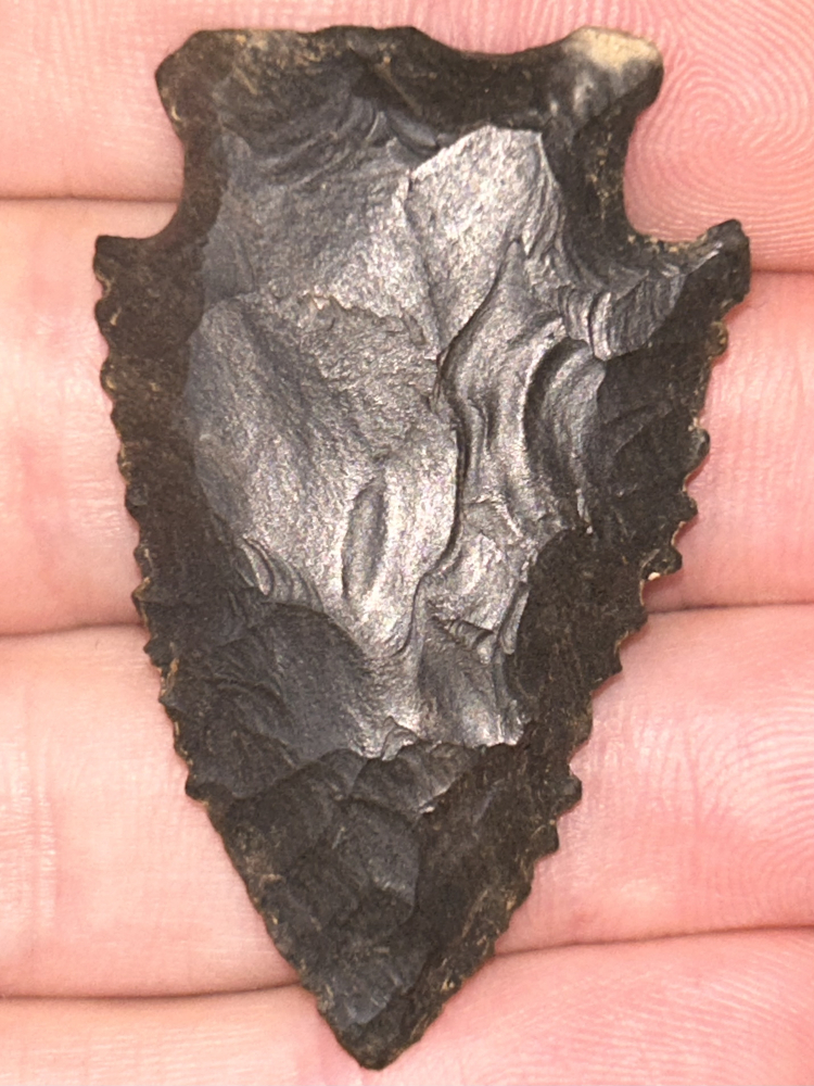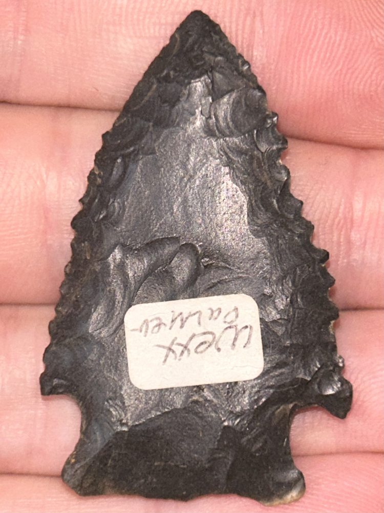 A fantastic Palmer from Tennessee or Alabama based on material. Made from nicely patinated dark brown Dover chert. Good size with great edge work and serrations. Ex: Robert Overstreet collection of the Overstreet Identification and Price Guides.
