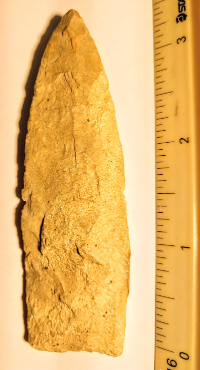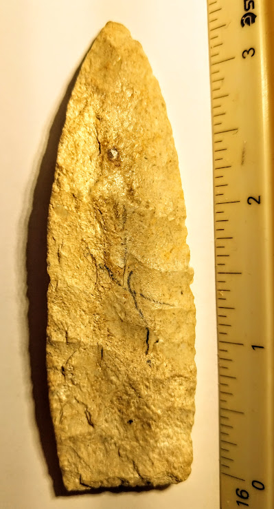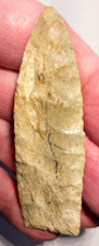This well-flaked Plainview point was found in Central Missouri and comes with a Jerry Dickey COA. This piece is ground over 1" up from the base on both sides and one side of the blade exhibits great paleo collateral flaking.