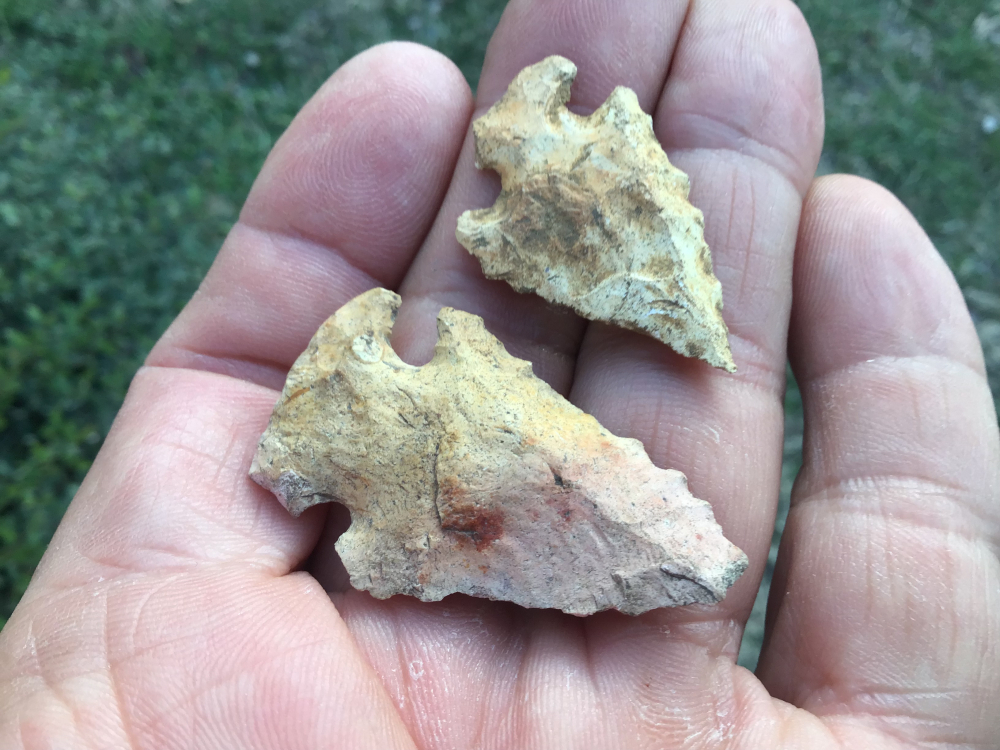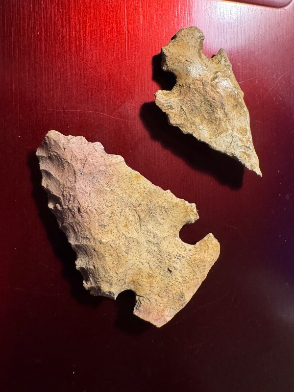 One is a Dovetail with steep left-hand bevels, the other probably a Lost Lake also with steep left-hand bevels. Out of Wild Bill's collection, they are from the Southeast, most likely Tennessee, Kentucky area, but specific provenance is lost. Both have ground bases and heavy patina. I will guarantee authenticity and satisfaction.