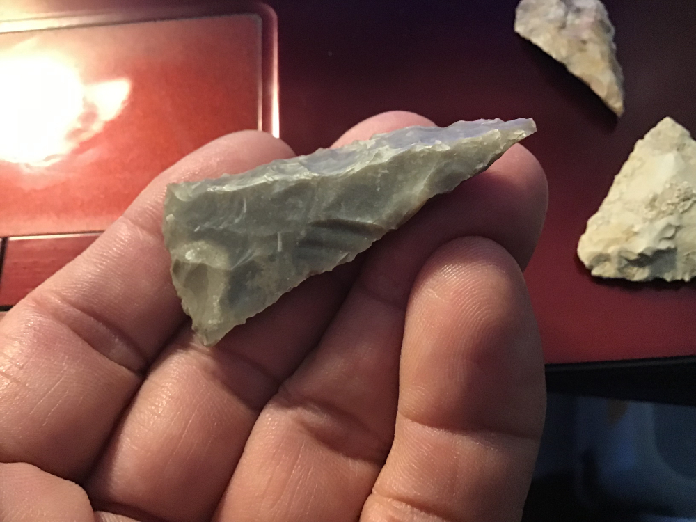 I just love these triangle points. Four of this group found by the same person all purchased from the finder. There is a Tortugas, Desmuke, Catan, Matamoros all from Zapata and Starr counties and a Early Triangular from Gillespie County. It is a good way to add several types at one purchase. I will guarantee authenticity and satisfaction.