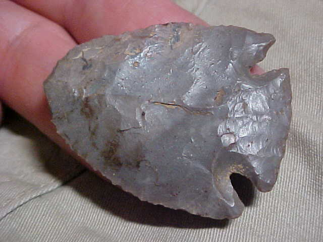 Only light basal edge grinding on this hornstone Kirk point--it the edge grinding had been more 'polished' I might have said "Lost Lake--a Stage-1 Lost Lake (no blade edge resharpening, no bevel to the blade edges. Check out the close up photos, the chipping work is as fine as any Early Archaic point you'll come across. Length is only 1&3/4", but the blade doesn't have a salvage look (or the thickness a longer blade would have had)--thinness never exceeds 1/4"--width is 1&5/16". The very tip does show a couple tiny 'repair flakes' made to keep the tip sharp. With this type of Harrison County, Indiana, hornstone there is color-banding--a nodule-type hornstone, not a layer (lense) flint--the center of the nodule shows off the edge, the higher quartz center of the sphere. Found in Posey County, Indiana, lifetime guaranteed authentic in every detail. Shipping is $8.00, with checks or M.O.s the way I welcome payment. Sorry, I do not use paypal--Roy A.