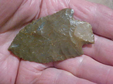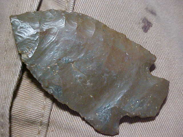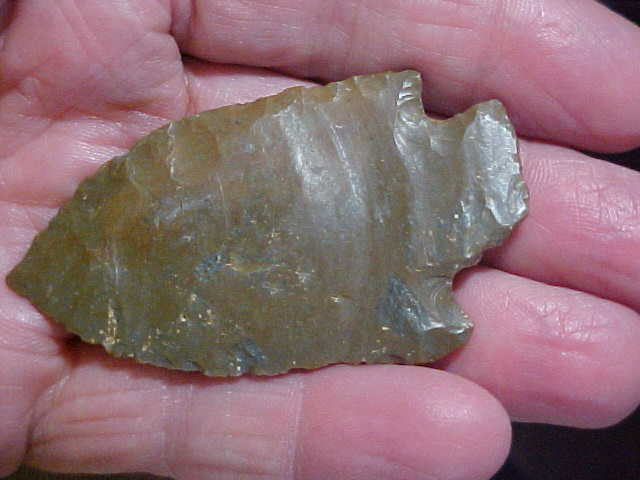 One of my favorite creek finds EVER, this Hardin dates from back somewhere around 2010 or 2012--Webster County, Kentucky, area, super patinated Hornstone, weathered by the creek-carried minerals (and sunlight) to a bronze color. Length is 2&11/16" by 1&1/2". Looking at the flat face it's not hard to figure out the Early Archaic flint knapper began with a large flat-sided flake, not a bifacial blade--the reverse has chipping from barb to tip and down the opposite blade edge--the center of the blade, even the stem they're smooth--or show the 'ripple' of the flint as it was shattered from a large Hornstone chunk. The front face is medial ridged, and the only flat plane is on the stem--see the close-ups if that's hard to follow. Every detail is guaranteed authentic, period. Shipping is $8.00 with checks or M.O.s welcomed. Sorry, I do not use paypal--Roy A.