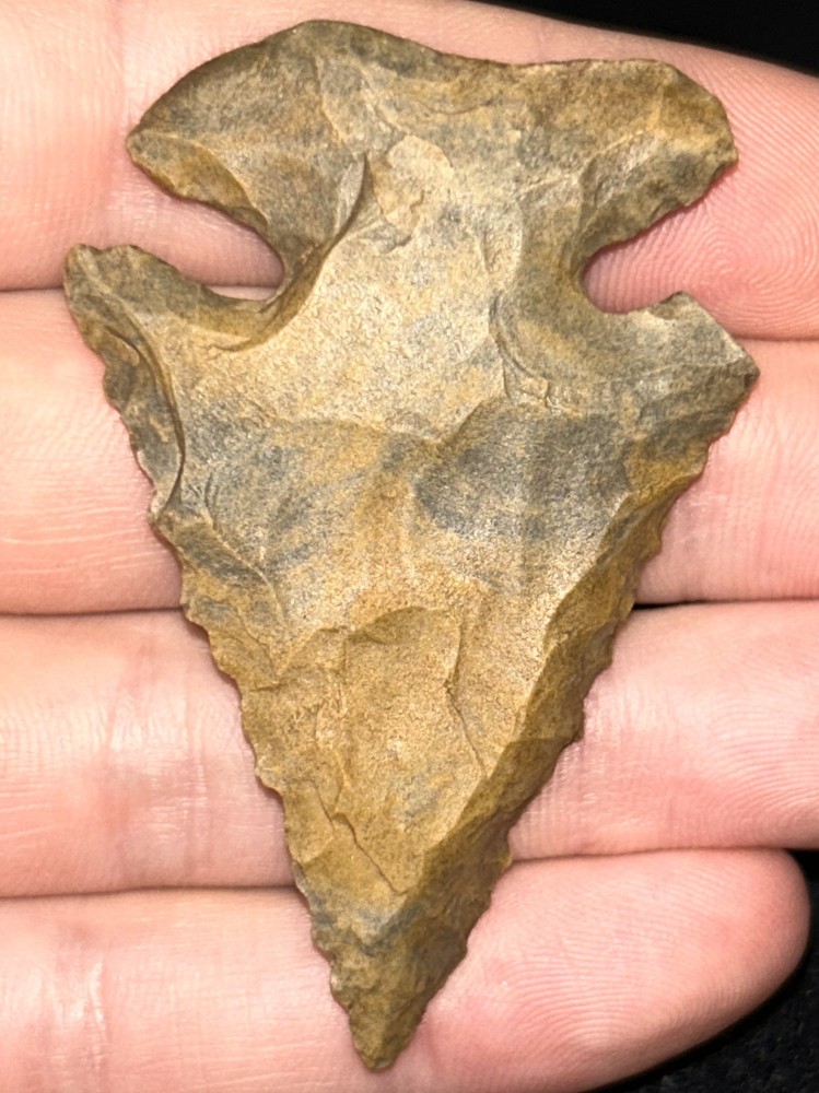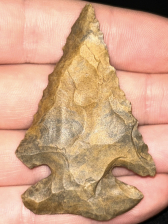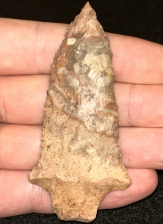 A fantastic Thebes found in Dubois County, Indiana. Made from beautifully creek stained Hornstone. Outstanding style and form with lightly serrated beveled edges and heavily ground base.