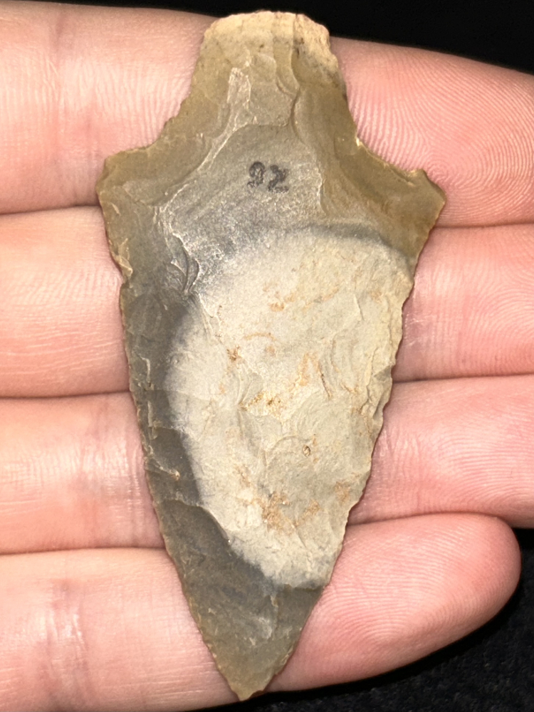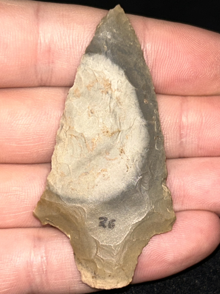 A fine Pickwick found in Webster County, Kentucky. Made from beautiful Hopkinsville chert with a great bullseye on one side. Good form and nicely made.