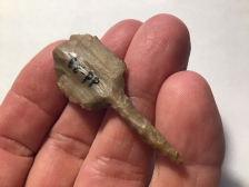 Made of quality Petrified wood with cortex polish on one side. The bit is in great shape, unfortunately there is a pick ding on one side of the base. I have the shipping and will guarantee authenticity and satisfaction.