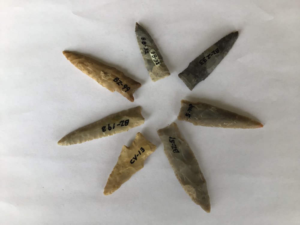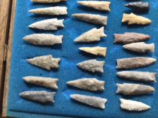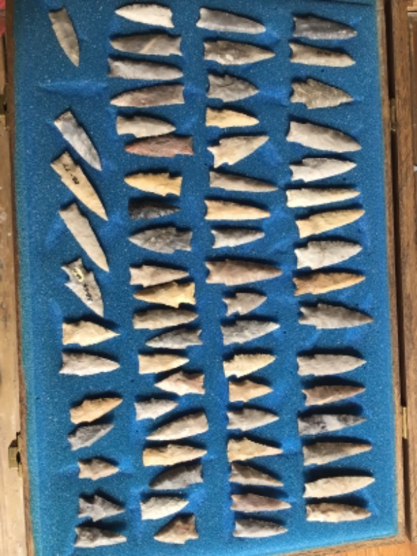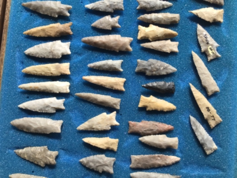 Let me offer this entire frame to start with. If it does not sell, I will break them up for individual sales. There are several very nice points in the group and a few with dings. All are guaranteed authentic with a satisfaction guarantee. I have the shipping. The only provenance I have is Texas at this point. There are provenance notes but I will have to do some leg work to get them.