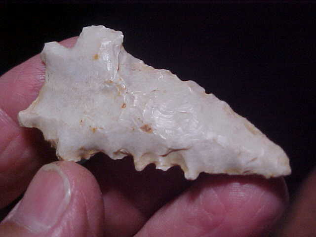 One blade edge, the Early Archaic Kirk culture knapper created some heavily serrate 'teeth'--but only on that right blade edge--or maybe they just used the Kirk Stemmed so much tha the serrations on the opposite blade edge simply broke in constant use--regardless, they're worn away. The piece came from a Muhlenburg--Christian County, Kentucky, collection. Length is 2&1/8" by 1&1/16", 5/16" max thickness up towards the tip (measured on a slight stack in the flint). Both faces of the base show channel flak thinning--not flutes, but the same principle, and being Kirk Culture there is very little to call basal grinding. The flint looks more like an Illinois Avon Chert than anything I can recall in Kentucky--probably has a specific chert-type name that I'm not familiar with--glossy, a high silicate flint. The reverse side has slight cortex and mineralization--100% guaranteed real. Shipping is $8.00 with checks or M.O>s welcomed. Sorry ,I use on electronic payment forms (like paypal)--Roy A.