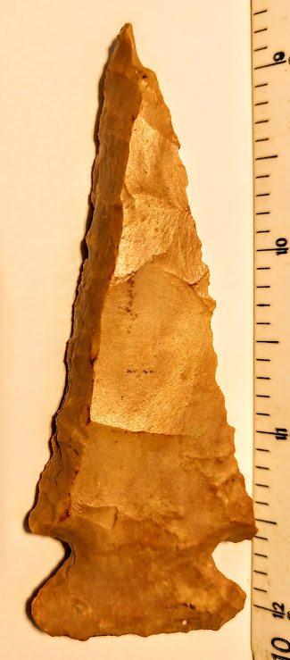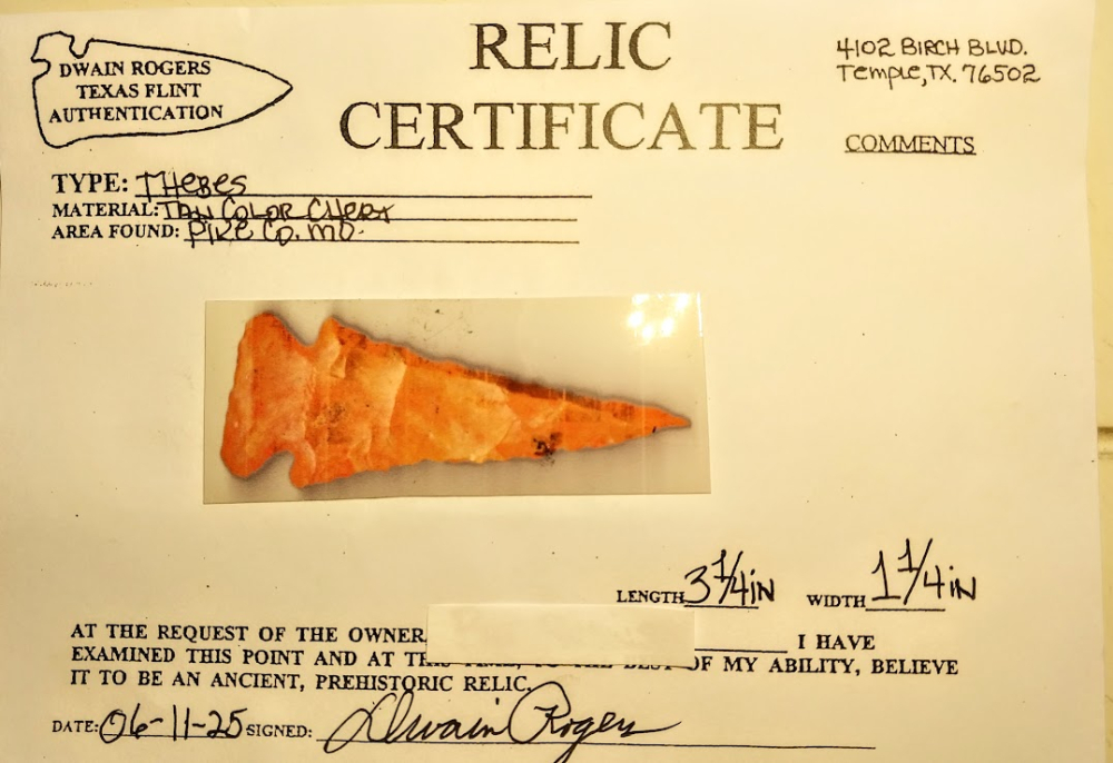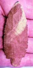 This red Thebes is beveled on both sides almost to the point of being a drill form. This Thebes was found in Pike Co., Missouri and comes with a Dwain Rogers COA. It is made out of a high-quality red-jasperlike material.