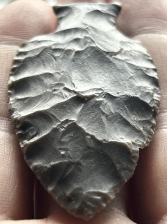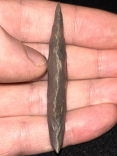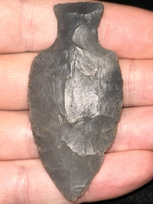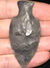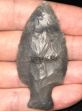 A fantastic Table Rock found by Howard Lutz behind the famous Crib Mound in Spencer County, Indiana. Made from high quality blue-grey Hornstone. Classic form with great workmanship and heavily ground base. Ex: Curt Wheeler collection.