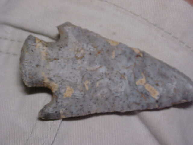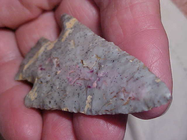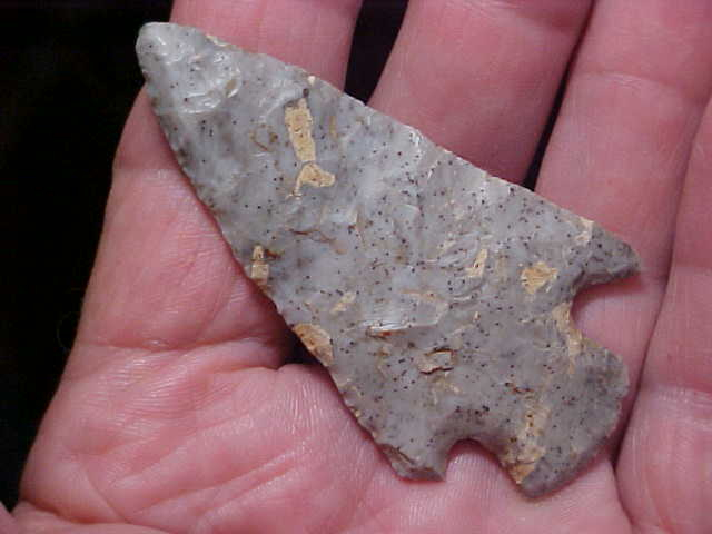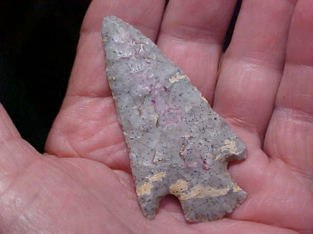 Out of a Hopkins County, Kentucky, collection, but whether the piece was found in Hopkins County, or was found nearer Paducah, where the man previously lived, that is unknown--trying to match-up that fossil laden flint with types found in the area, I've drawn a blank. The material may be something that reached the Ohio River from the Illinois counties--a Kincaide Chert (due to all the fossils present)--that's my best attempt at classifying the material--even looked at a Bailey Chert that was heat treated. When you have one piece in a whole collection, you know the finder lived in more than one location, you draw on every resource you can to identify 'difficult to classify' cherts. Length is 2&13/16" by 1&1/2", barely over 1/4" blade thickness. Being a Motley there is no basal edge grinding, but the sides of the stem are definitely ground. One barb is slightly shorter than the opposite barb, and that's the sum of any damage. Patina is great, the piece is guaranteed real--please note there is a red washed-out stain on one face, it looks like someone once wrote a bit of provenance in a red ink, then decided to remove it--doesn't come off. Shipping is $8.00 with checks or M.O.s welcomed. Sorry, I never ever use paypal--Roy A.
