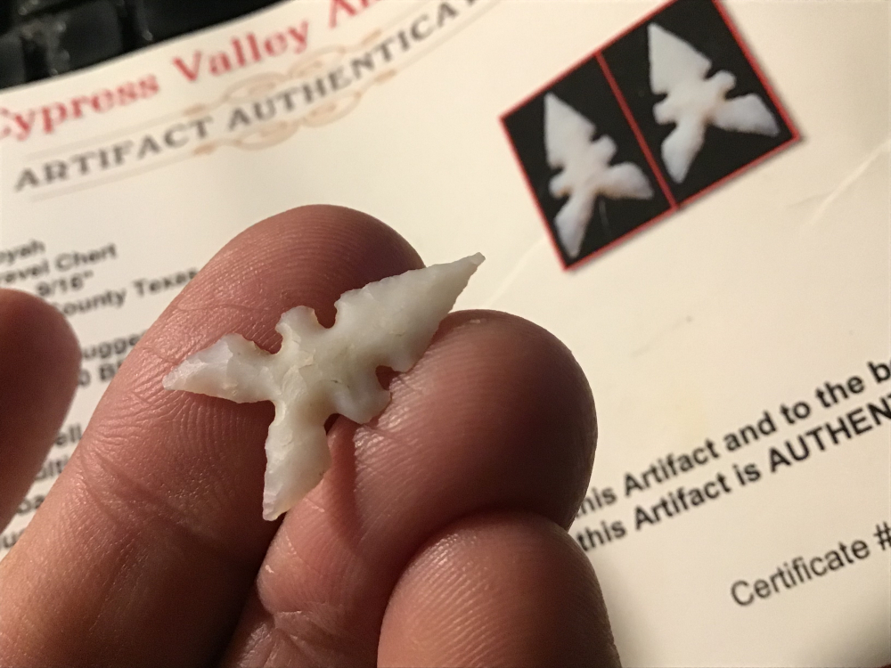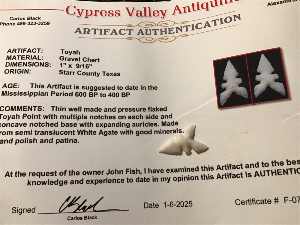 This is a very pretty Toyah recovered in Starr County. It has multiple notches with lng barbs. It comes with a Carlos Black coa. I have the shipping.