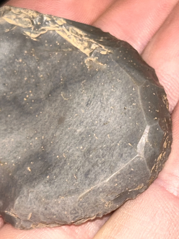 A fine scraper found by Jim Schuppert at the Dalk Mountain Site in Harrison County, Indiana. Made from glossy light grey Indiana Hornstone. In good condition with nice edgework.