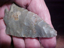 One basal corner away from being a $350+ Decatur (it isn't the fractured base variety. This Warrick County, Indiana, point/ collection was stored for decades--unless it's in a creek pieces like this 3&3/16" by 1&7/8" Decatur simply aren't found anymore--not this close to intact, anyway, plowing doesn't go deep enough. The basal corner nick is Early Archaic use-made, as is the very slight wear to the very tip. Please understand, if I sell a piece I'll say up-front if there is something, some feature that's been use-worn, or dinged--I'd much rather someone buy a piece with their eyes open, know two things: the condition described as accurately as I'm able, and that what they buy is guaranteed authentic for as long as I'm alive (hope to reach 100 some day, lol). Shipping on this fine point is $8.00 due to new postal rates, and I welcome payments only by check, cash, or money order--I do not use paypal--Roy A.