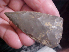 One fine, fine Waubesa,, and judging from all the sandy soil in the crevices of the flint itself, a riverbank find--slightly past 3&1/4" by nearly 1&9/16", but only 5/16" max thickness. The piece came from an Illinois estate--actually the only piece of flint the family had to sell. While I can provide the N.W. Illinois county, that doesn't provide any great provenance--the flint doesn't have the patina of Illinois Hornstone (Cobden, which patinates a brown color, shows multiple bandings in the flint)), but more resembles either an Indiana or Kentucky hornstone. Families move, their possessions travel with them, and that's why I think this Waubesa came from somewhere considerably east--or southeast--of its last home. Note there is slight tip wear, closeup photo should show it, and there is one very small spot of glue on one face--maybe that small glue-spot kept the piece from sliding in a shadowbox--easily removed, though. Every detail is lifetime guaranteed authentic. Shipping is $7.00, checks or M.O.s are how I take payment. Sorry, that means paypal-type payment services are not used--Roy A.