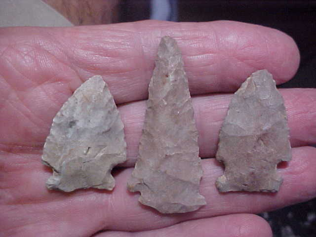 A Kirk, a Pinetree ( the longest at 2"), and a side-notch Big Sandy--even the cornernotched Kirk Dart (1&5/16" by1") shows some basal grinding, so you could even roll the cornernotch into the Palmer or Pinetree groups, basal grinding being more how they finished-out a dart point. The 1&3/8" Big Sandy seems to be a Jasper material--a worked river pebble. The longer point and the Cornernotch are the same flint, only the one, the longer point, being heat treated flint. Both seem to be Illinois flints, something like Avon Chert is my best guess as it wasn't a locally found material (unless there's a chert bed no one has reported--that happens). Good dart points, great workmanship, and a bit of wear as the pictures will show. Translation: REAL. Shipping is $8.00, checks or M.O>s are the ways I welcome payments. Sorry, that means payment services like paypal are not taken--Roy A.