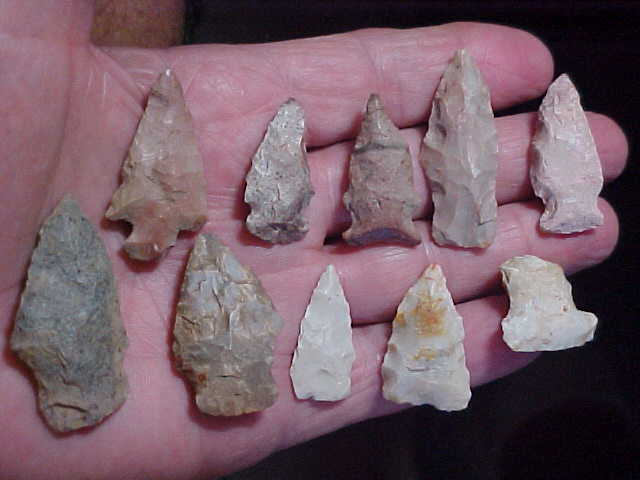 Ten Gibson County, Indiana 'points'--most are Mid-to-Late Archaic dart points (or Early Woodland Culture), but the two triangles are true bow-and-arrow arrowheads. The longest is the Adena type, 1&13/16"--the very well made white Madison (triangle) is 1&1/8". These ten came from hunting camps along the Wabash River, all are guaranteed authentic. Shipping is $8.00 due to the weight, and checks or M.O>s are how I welcome payment. Sorry, I do not use paypal-type payment services--Roy A.