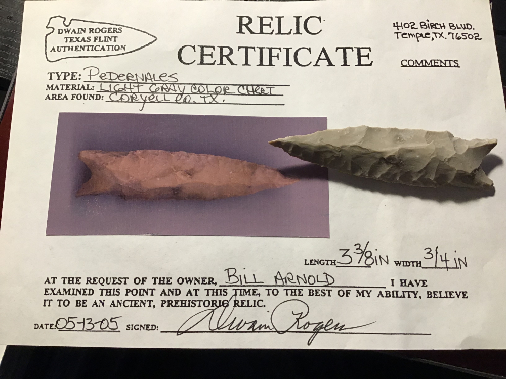 Long and narrow Pedernales recovered in Coryell County. It has a small stack on one side to a nice tip. It comes with a Rogers coa. I have the shipping.