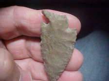 Out of Trigg County, Kentucky, a Kirk Culture dart, a "Palmer" if you think the serration is heavy enough to qualify for that 'usually serrated' dart point. There is some serration, yes, but not exaggerated as are many of the Palmers--there is also some basal edge grinding, and that IS a trait you expect on Palmers--Kirks being hit-or-miss in the degree of basal grinding. Made of Hornstone, length is an excellent 2&3/16" by 1&1/16", the thickness only 1/4". I wish the one basal tang was there, but the break is ancient, easily seen patina under a 10x loop. Simply said: authentic. Shipping is $8.00, checks, cash, or M.O>s are welcomed, but please note I do not use paypal--Roy A.