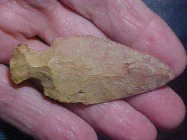 A Table Rock that's been in my collection a couple decades--found on a lake shore in the western part of the state--probably Trigg County as I don't know how widely the finder & family ranged. The Table Rock (or Bottle Beck if you prefer that term( is made of a colorful river-found Jasper2&3/4" by 1&1/8", a balanced 3/8" max thickness in the hafting area. The crevices of the jasper still hold soil deposits--clean if if you wish, I like the patina exactly as it is. Interesting feature--the tip was used as a drill, the edges are completely worn smooth, the rotation of the point (as a drill) wore away ANY sharp edges all the way down to the tiny notch indented on one blade edge, but mostly so in the top 1". A very interesting Mid Archaic point, lifetime guaranteed real. Shipping is $8.00 with checks or M.O.s welcomed. Sorry, I do not use paypal--Roy A.